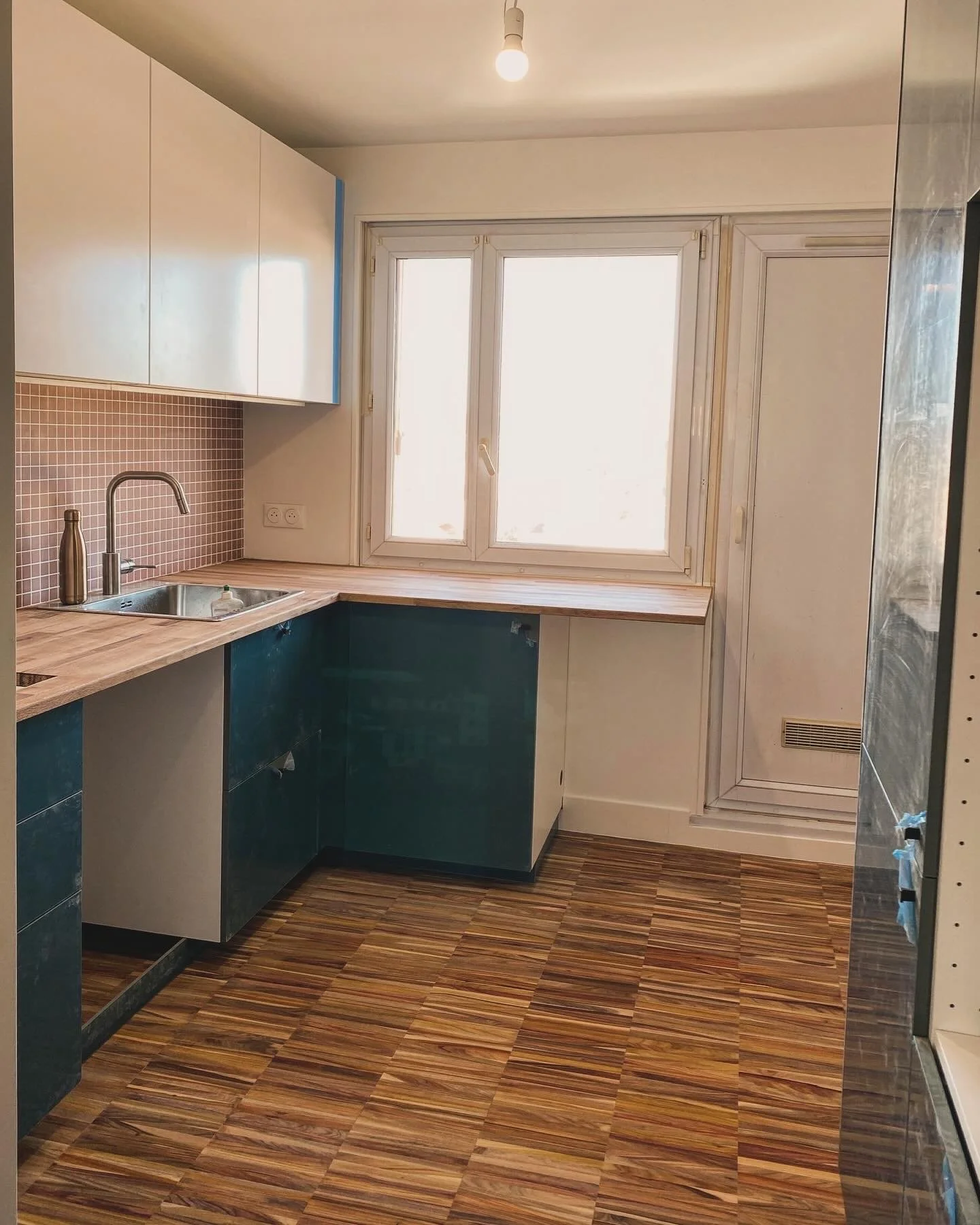 La pose d’un parquet industriel sur chants dans le séjour et la cuisine a demandé aux artisans d’expérimenter une nouvelle méthode. Et ce fut une réussite ! Les restes de parquet ont même été utilisés afin de créer le plan vasque de la salle de bain, pour un rappel et une touche unique.